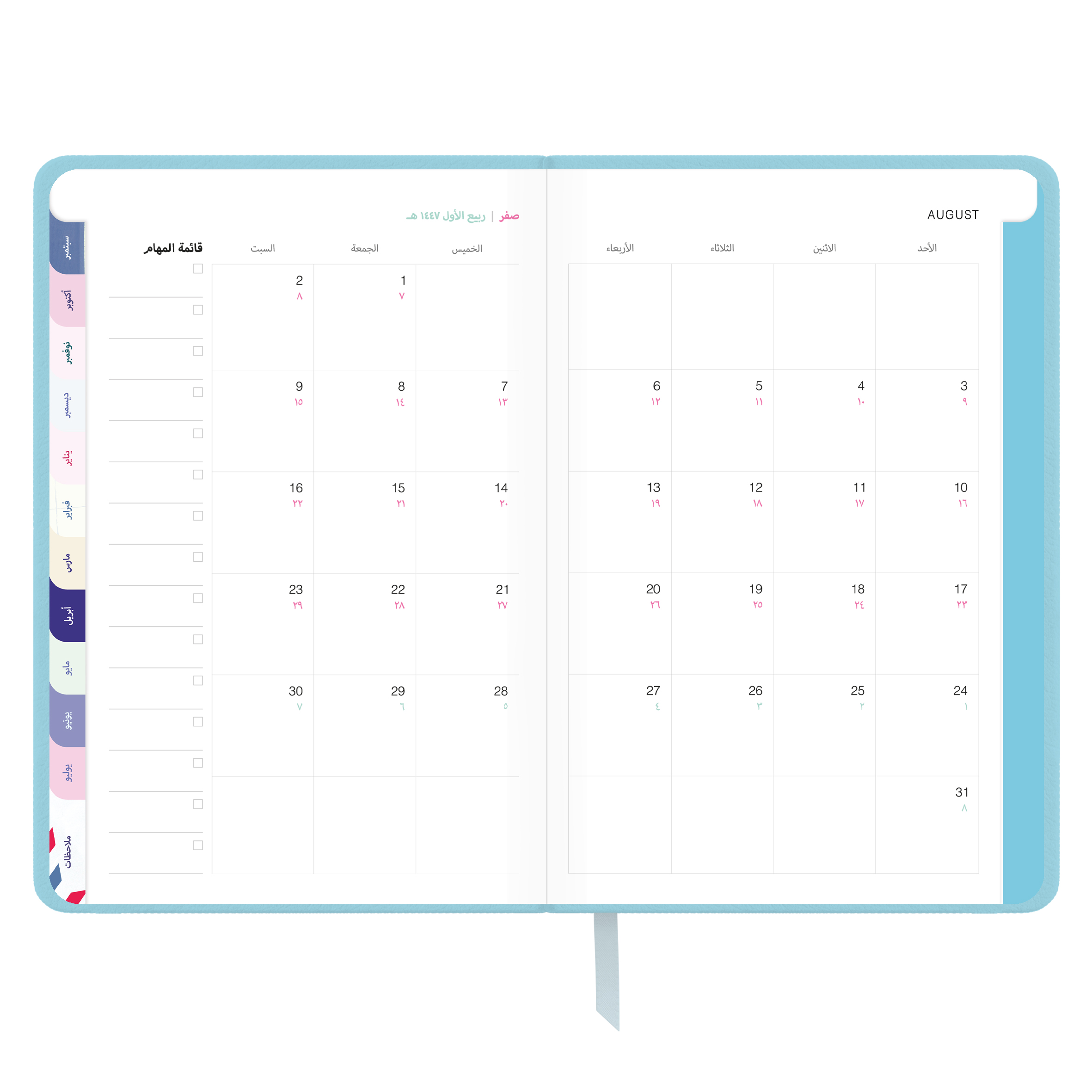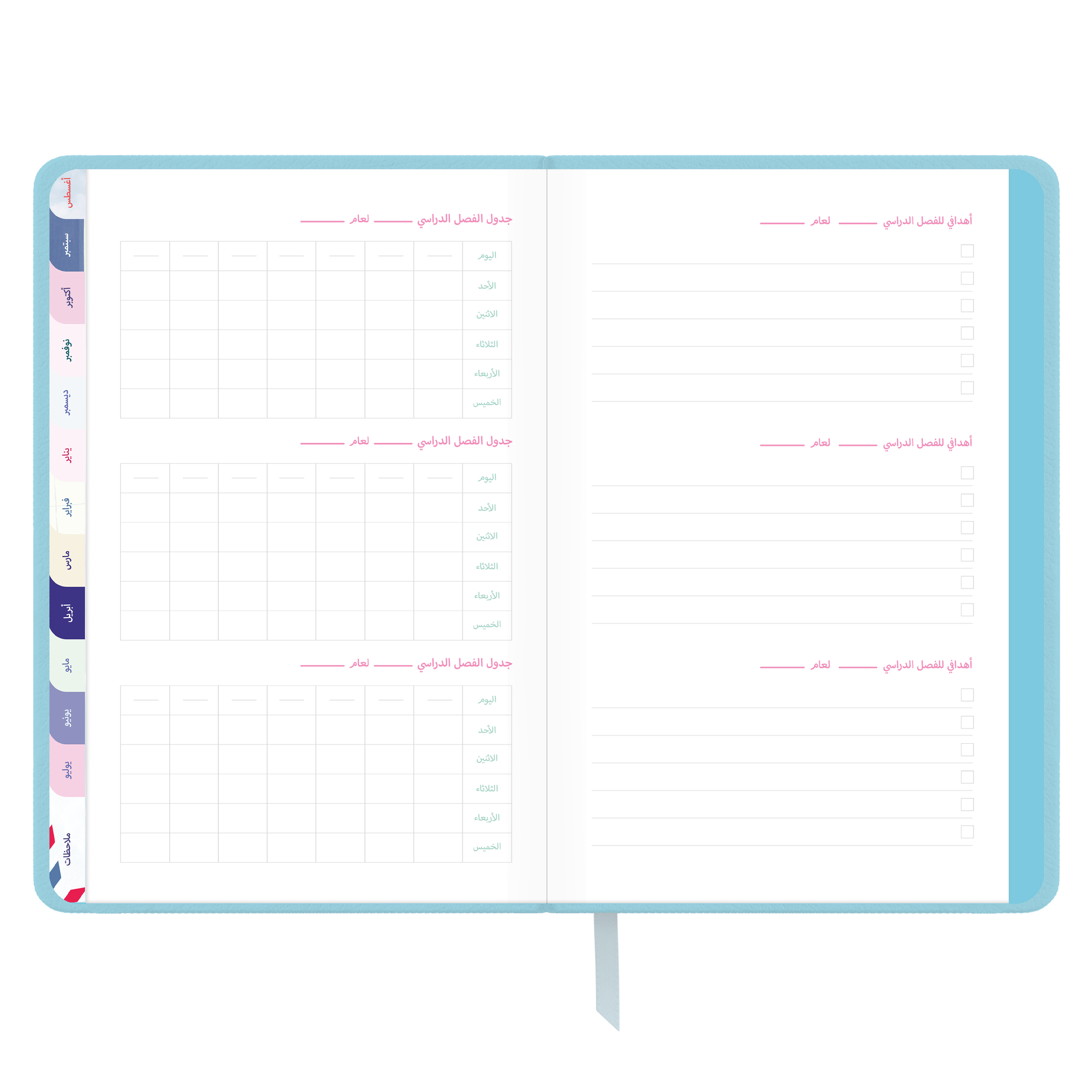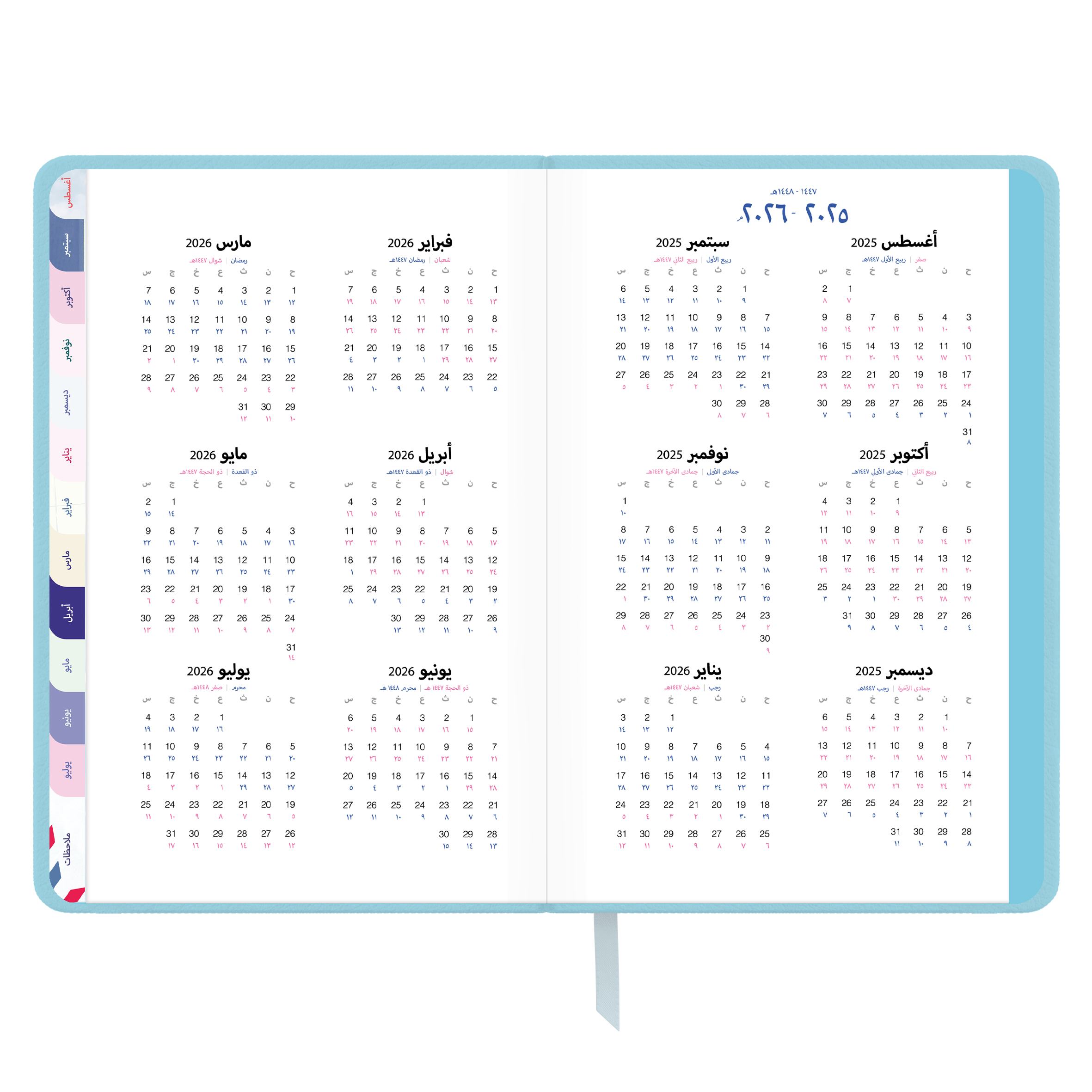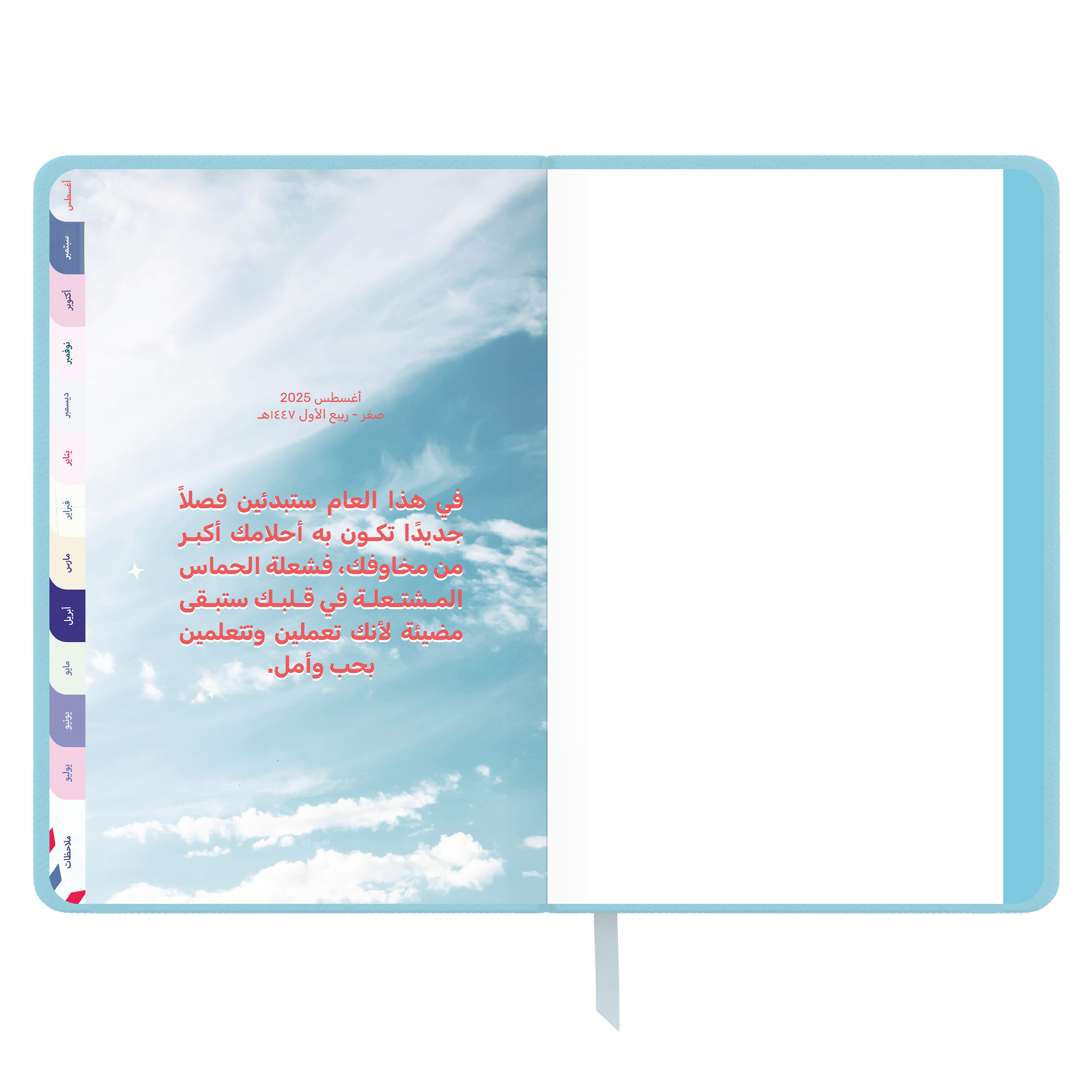 تغطي العام الدراسي كاملًا، تبدأ من شهر أغسطس ٢٠٢٥ (صفر ١٤٤٧هـ) وتنتهي في شهر يوليو ٢٠٢٦ (محرم ١٤٤٨هـ) – لتكون رفيقتك في كل خطوة خلال العام الدراسي.