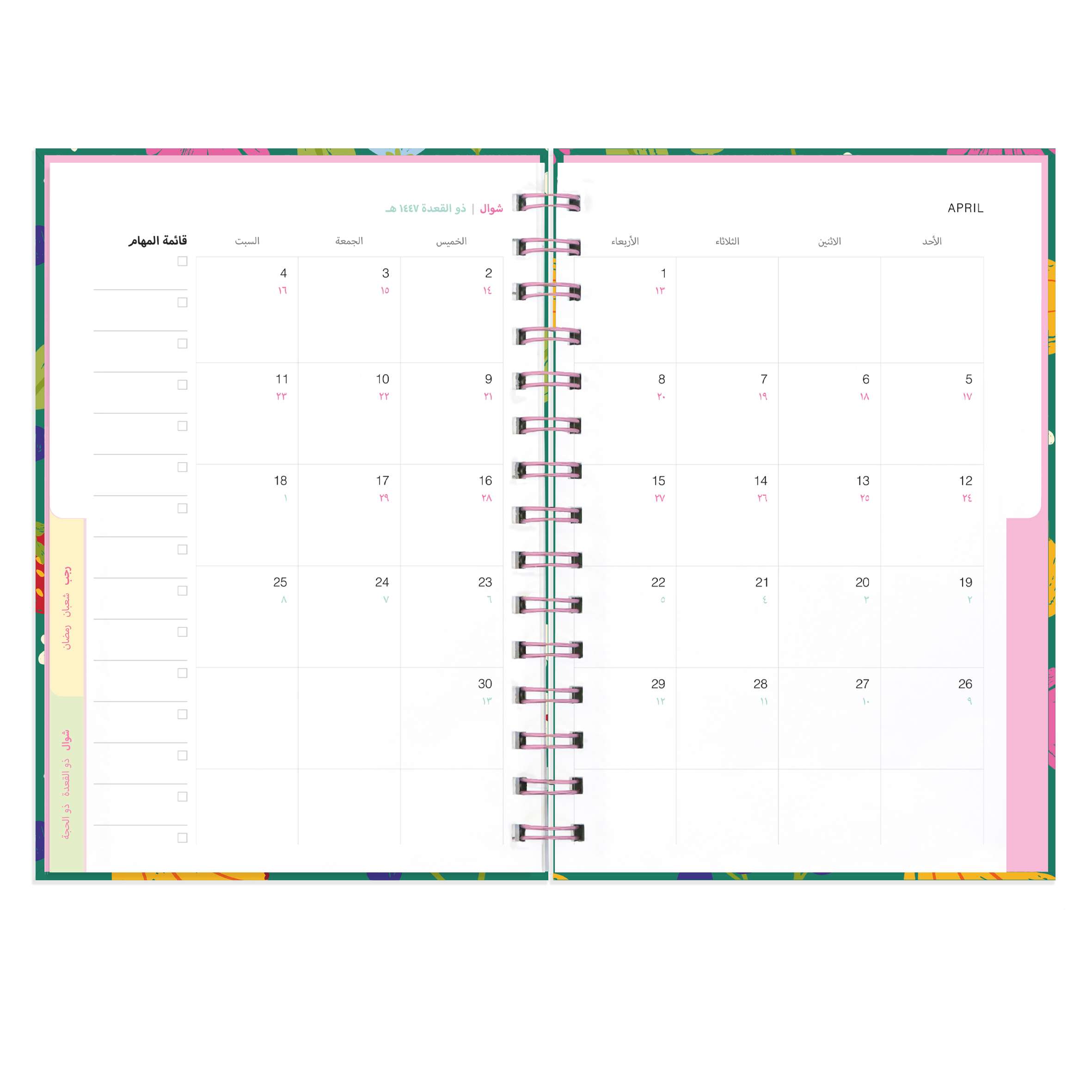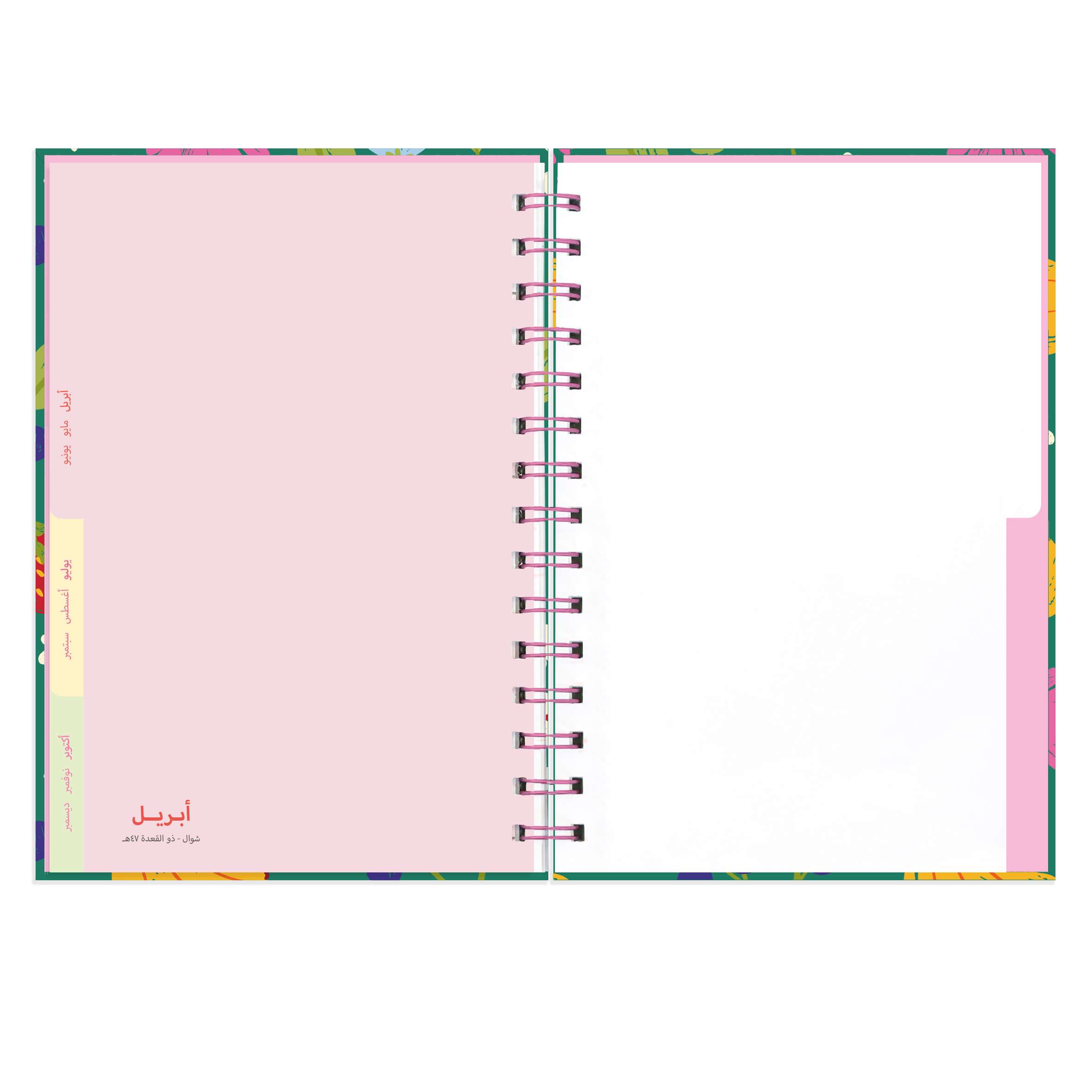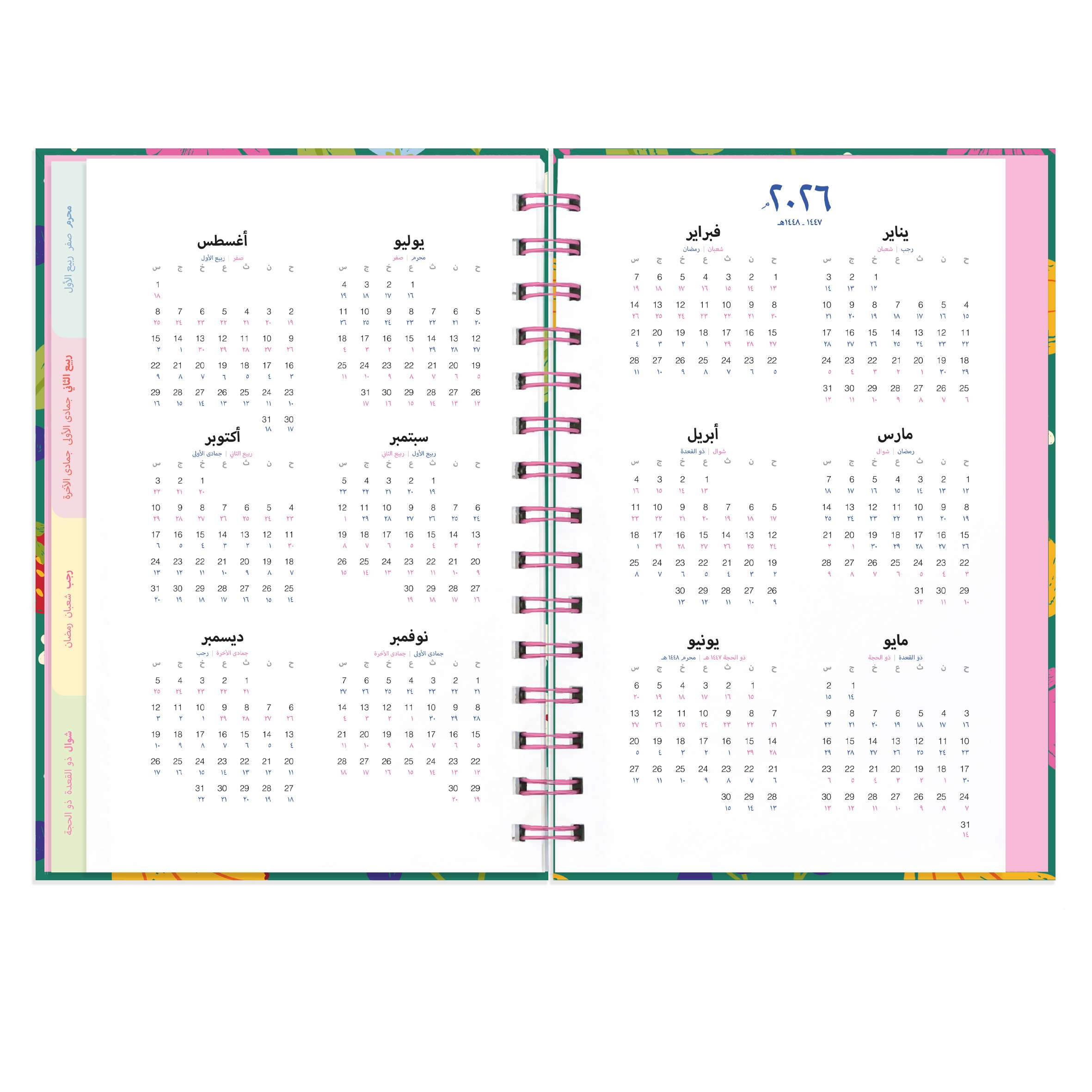 ابدئي عامك بتنظيم جميل مع أجندة “سين” لعام 2026م من مجموعة “بُستان”، بتواريخ ميلادية وهجرية، والمستوحاة من روح الصيف بتصميم منعش، والمُزيّن برسومات الأزهار والفواكه الصيفية وتفاصيل فضيّة لامعة على 2026 في الغلاف.