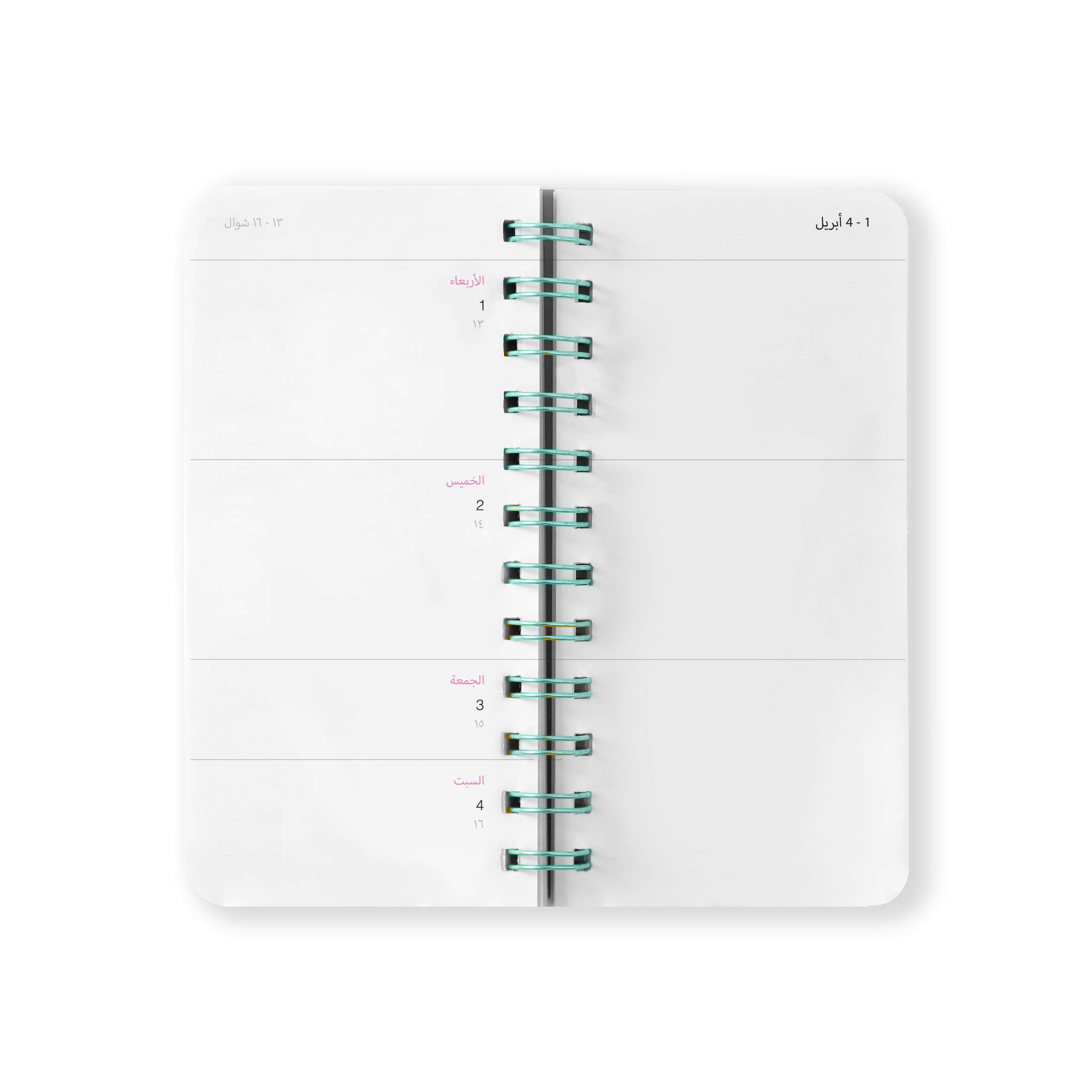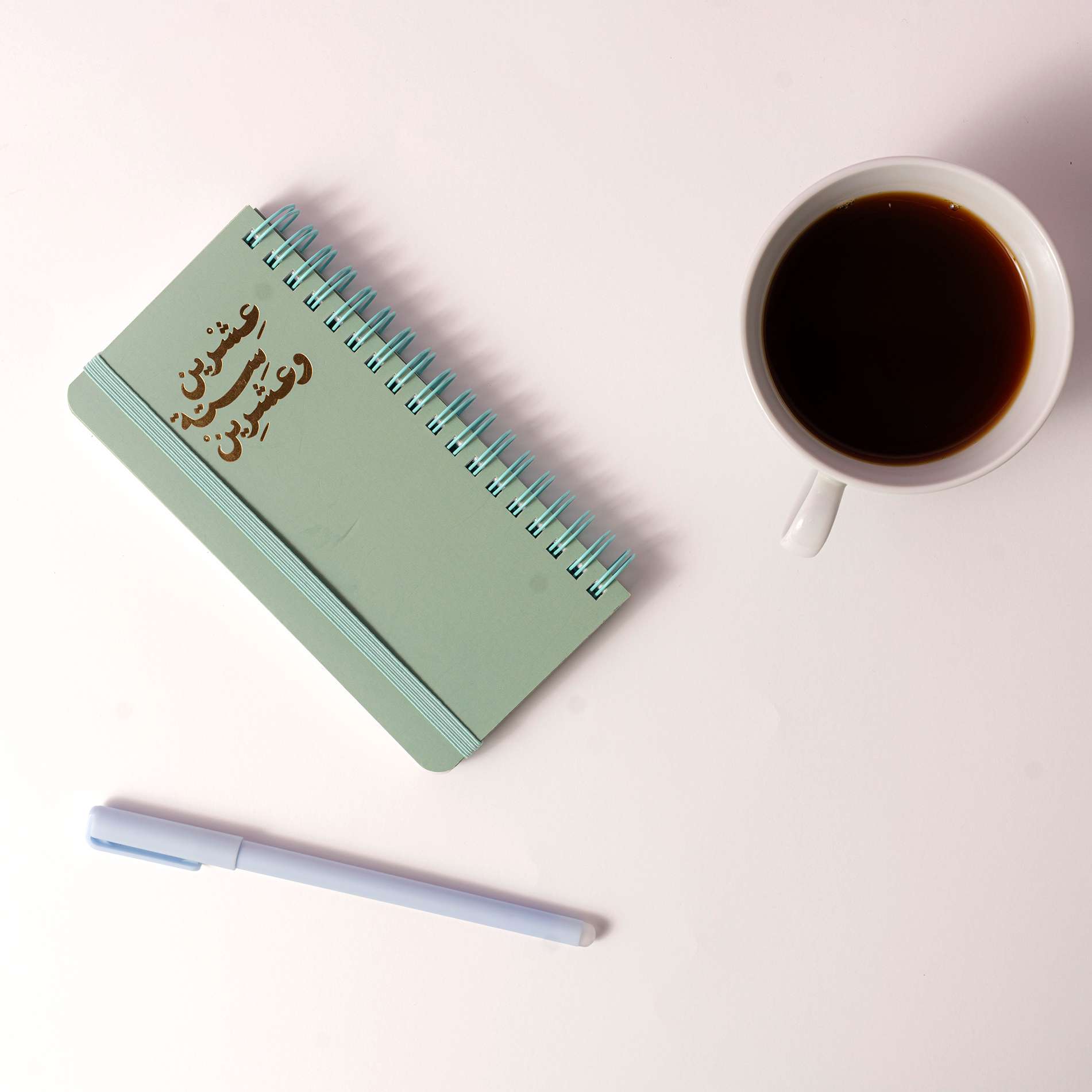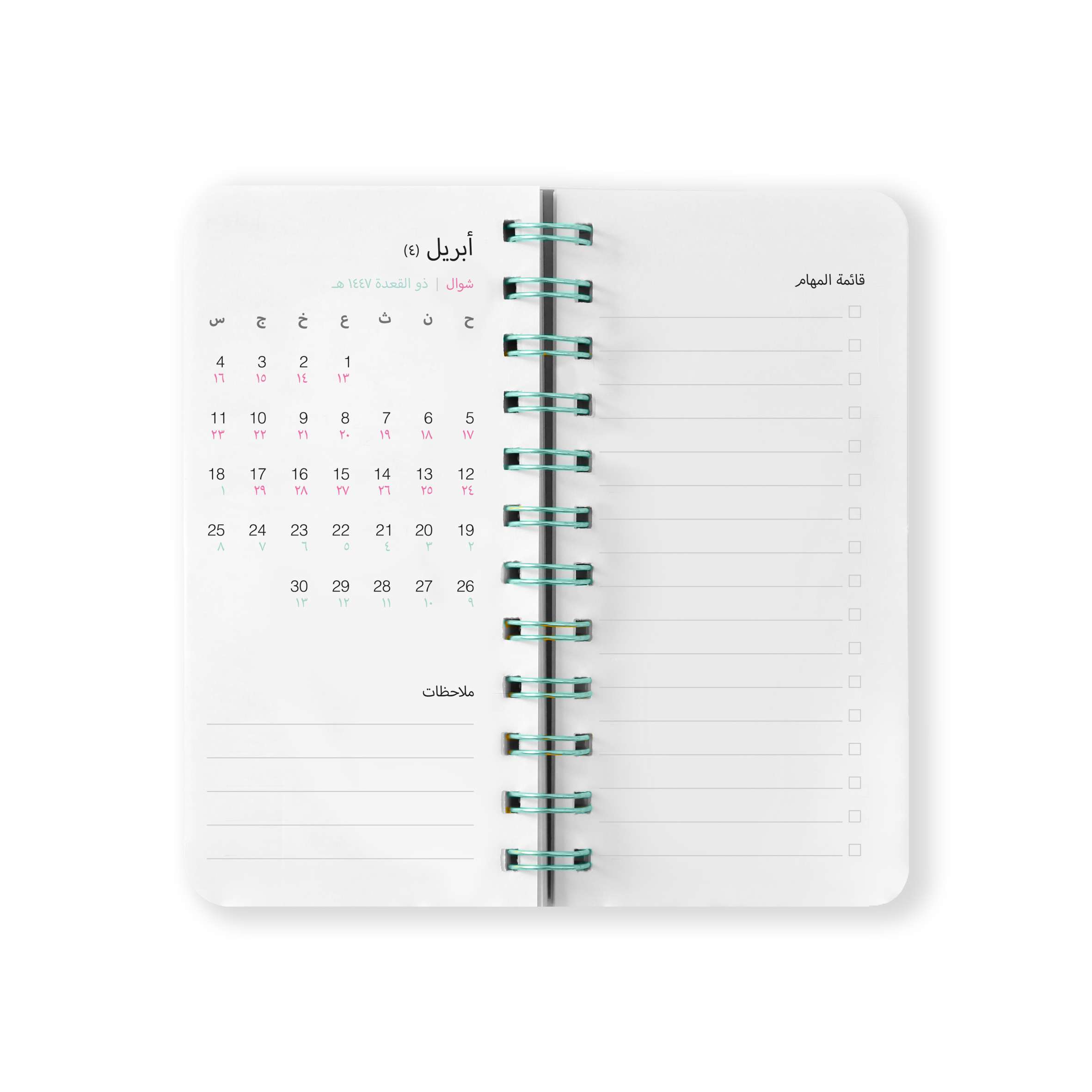 أجندة أنيقة وخفيفة ترافقك طوال العام، بلون تركوازي جذّاب وتفاصيل ذهبية لامعة لعبارة “عشرين ستة وعشرين” بخط يدوي حر. حجمها المثالي يجعلها الرفيقة الأفضل في حقيبتك، مكتبك، ومشاويرك اليومية.