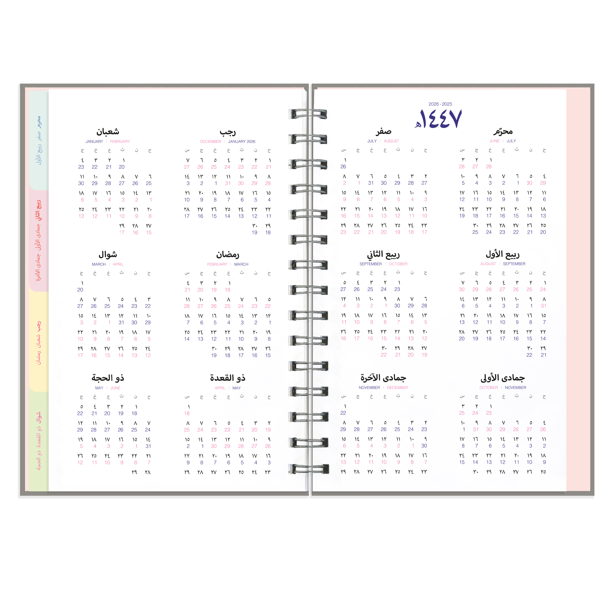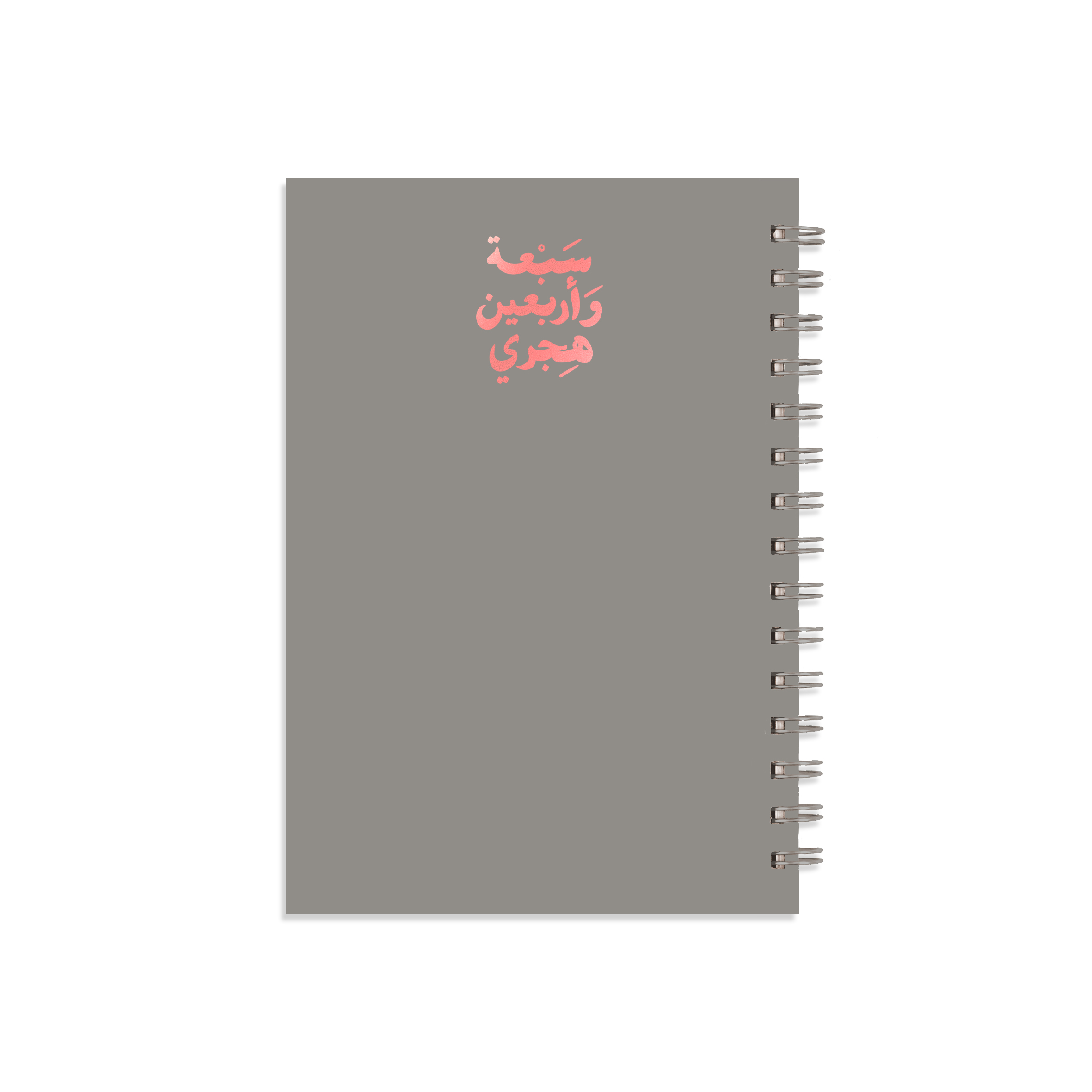 أضيفي لمسة من التنظيم والجمال إلى عامك مع أجندة سين لعام ١٤٤٧هـ بتواريخ هجرية وميلادية، والمُصممة بلون رمادي هادئ وساحر، مع عبارة “سبعة وأربعين” مكتوبة بخط يدوي حر بتأثير الوردي الذهبي المتلألئ.