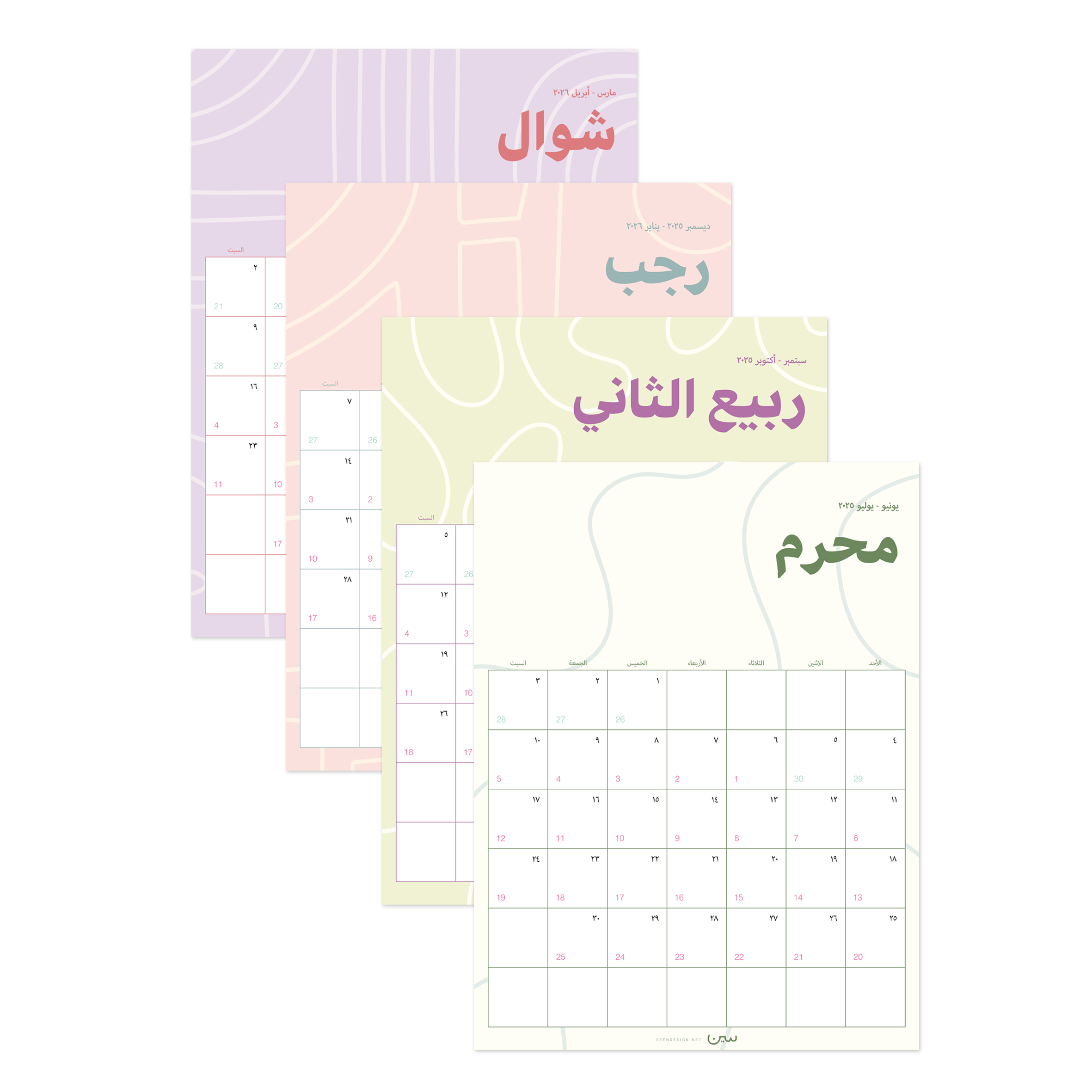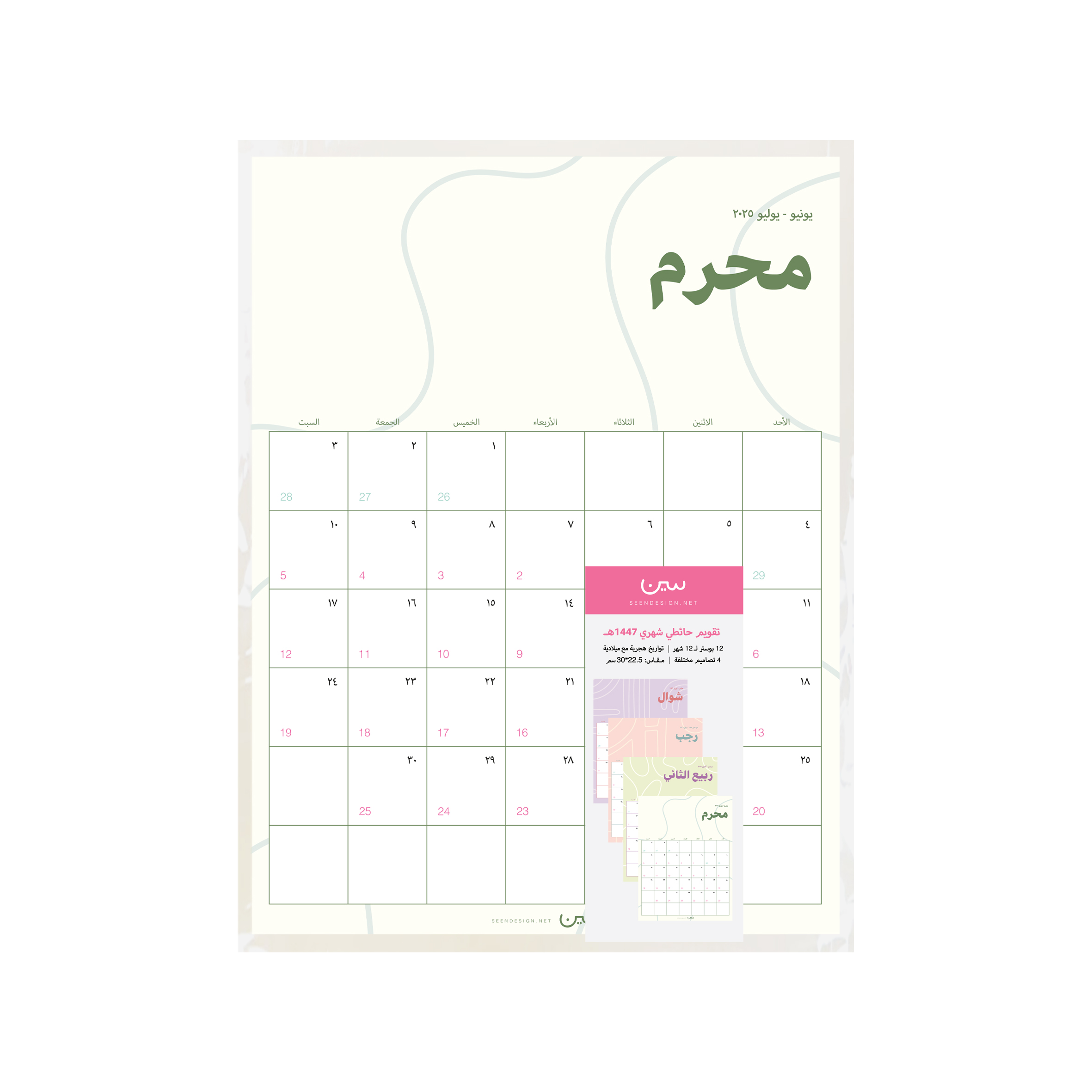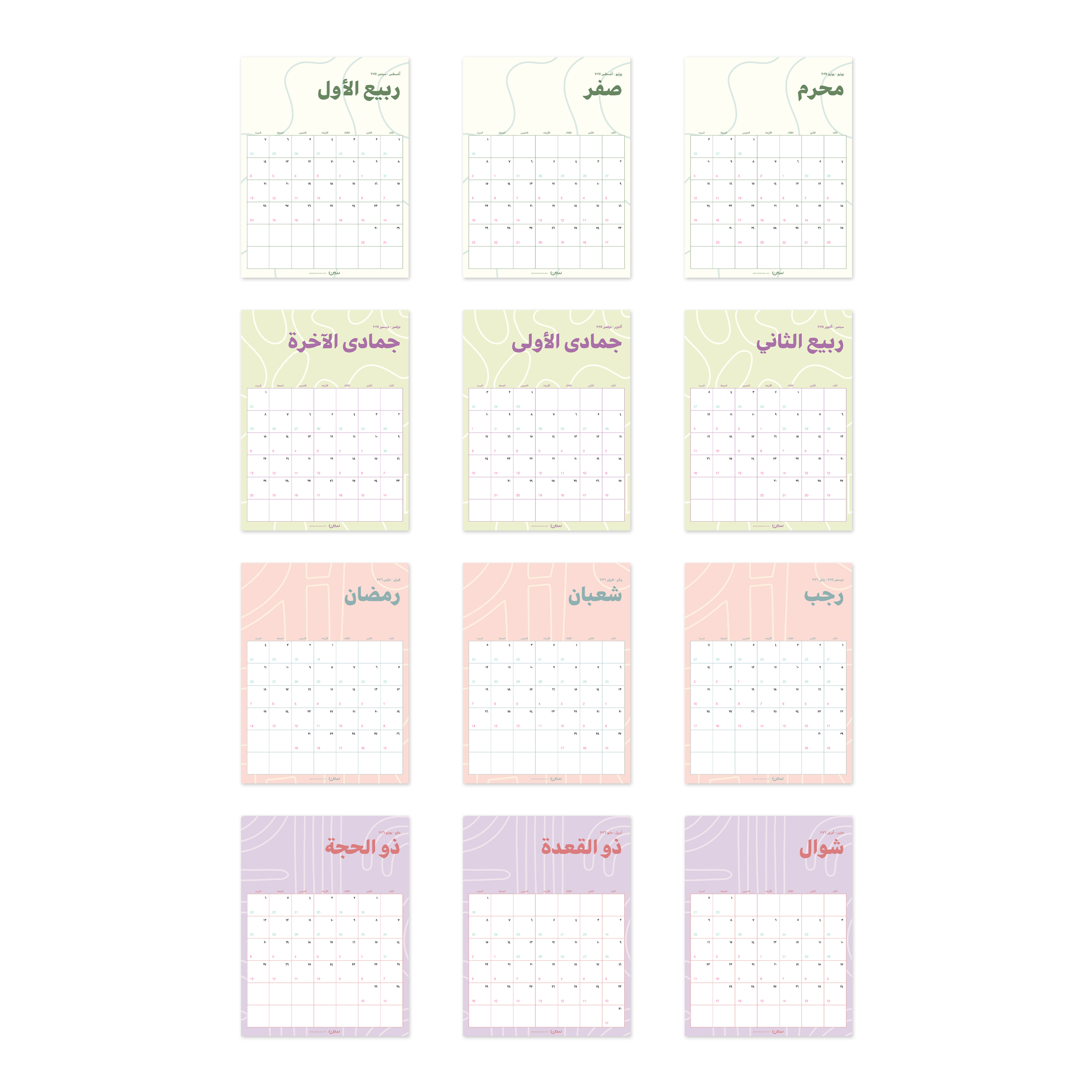 مجموعة مكوّنة من ١٢ بوستر شهري لعام ١٤٤٧هـ بـ ٤ تصاميم بسيطة تتكرر على مدار السنة، بألوان حيادية، تضيف لمسة هادئة وأنيقة، وتناسب مختلف الأذواق والمساحات.