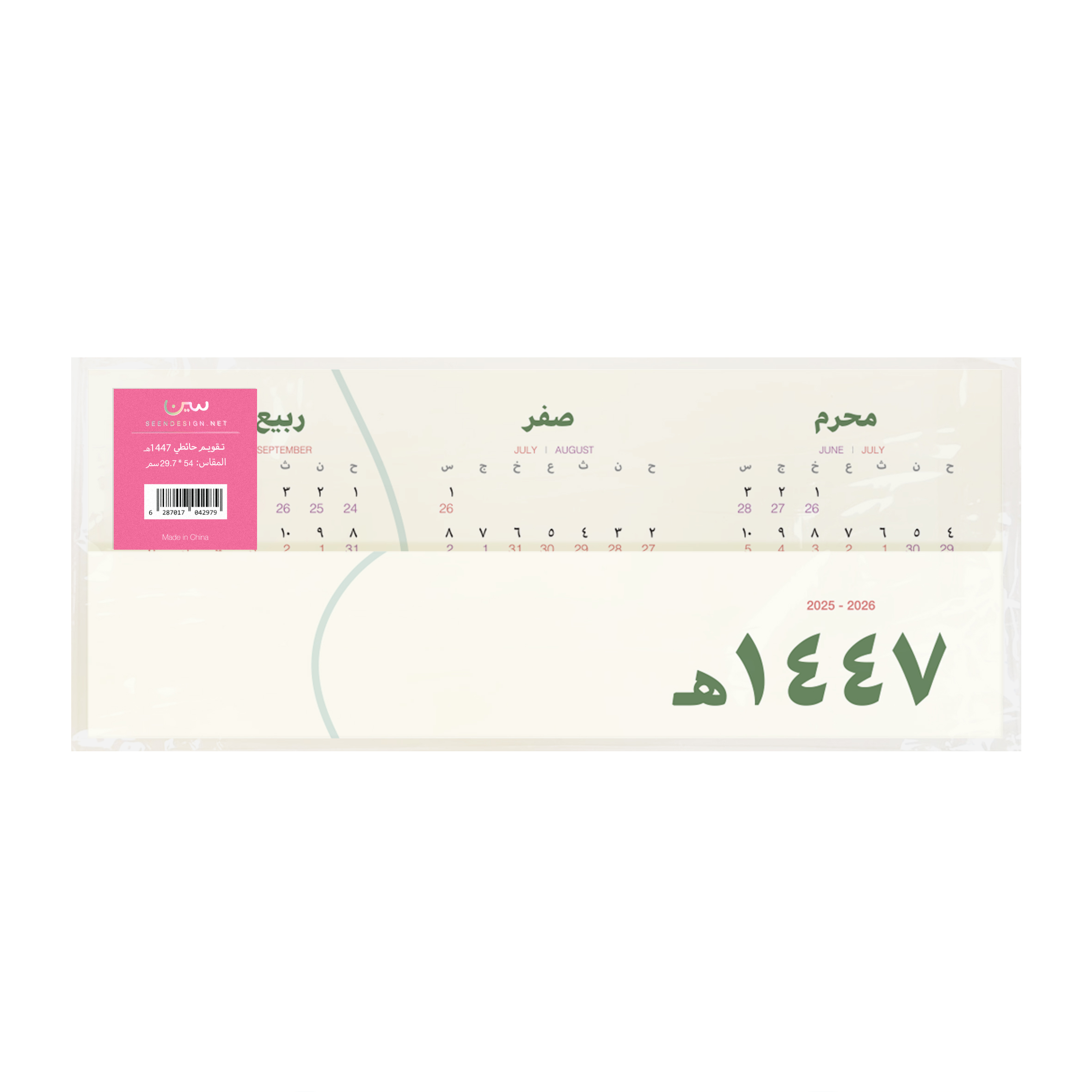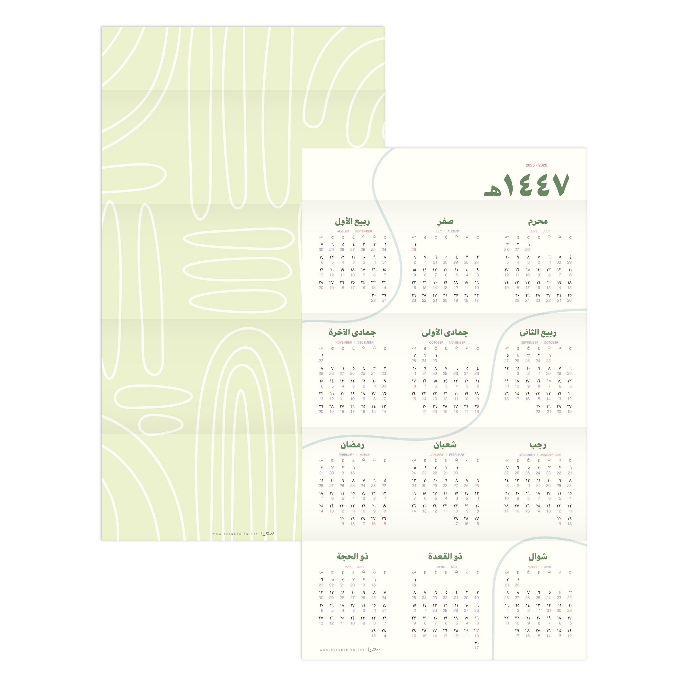 تقويم حائطي أنيق للسنة الهجرية ١٤٤٧هـ كاملة، مع وجود التواريخ الميلادية لتري أشهر السنة كاملة في مكان واحد بكل وضوح وسهولة.