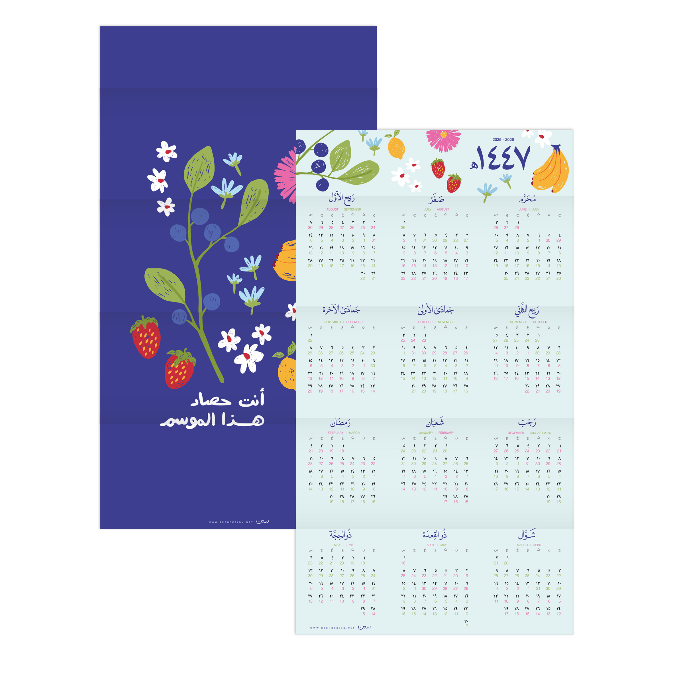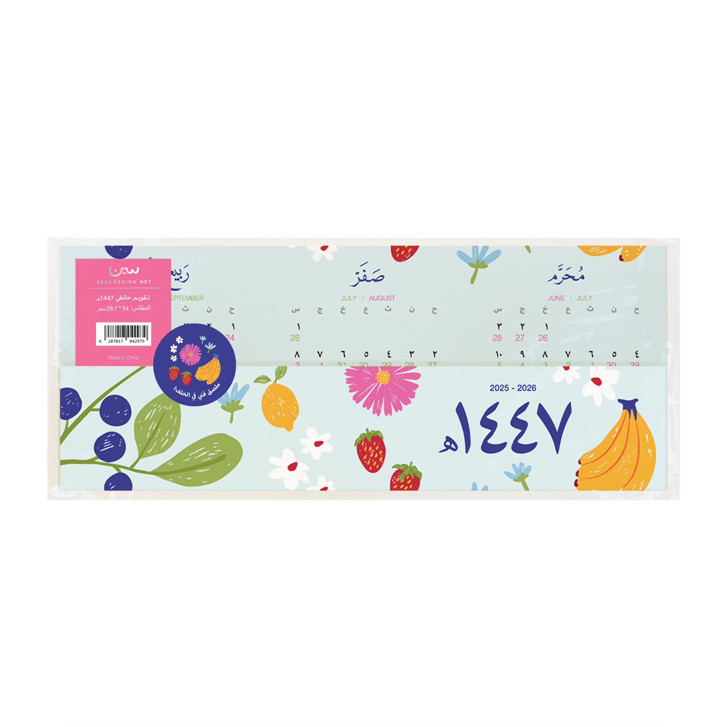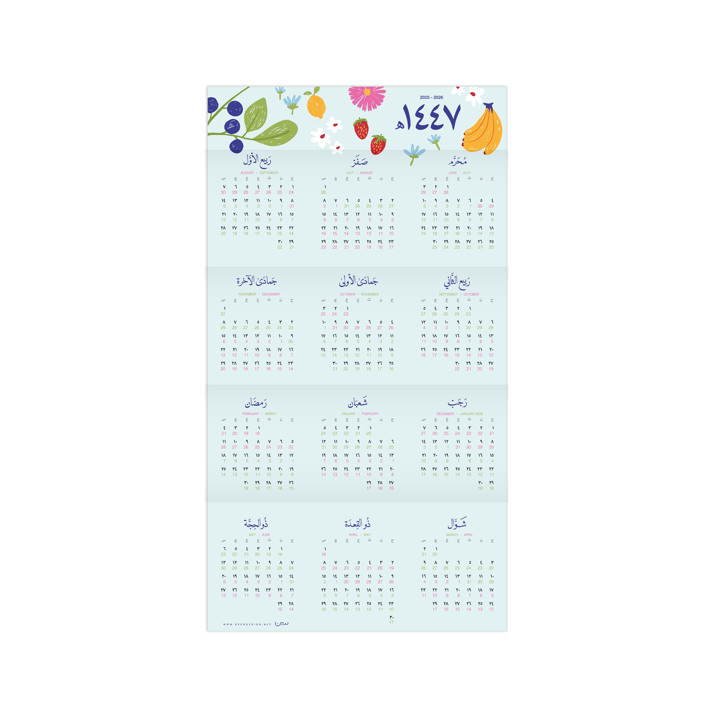 تقويم حائطي أنيق للسنة الهجرية ١٤٤٧هـ كاملة، مع وجود التواريخ الميلادية لتري أشهر السنة كاملة في مكان واحد بكل وضوح وسهولة، ضمن مجموعة “بُستان” بتصميم الفواكه الصيفية والأزهار المنعشة.