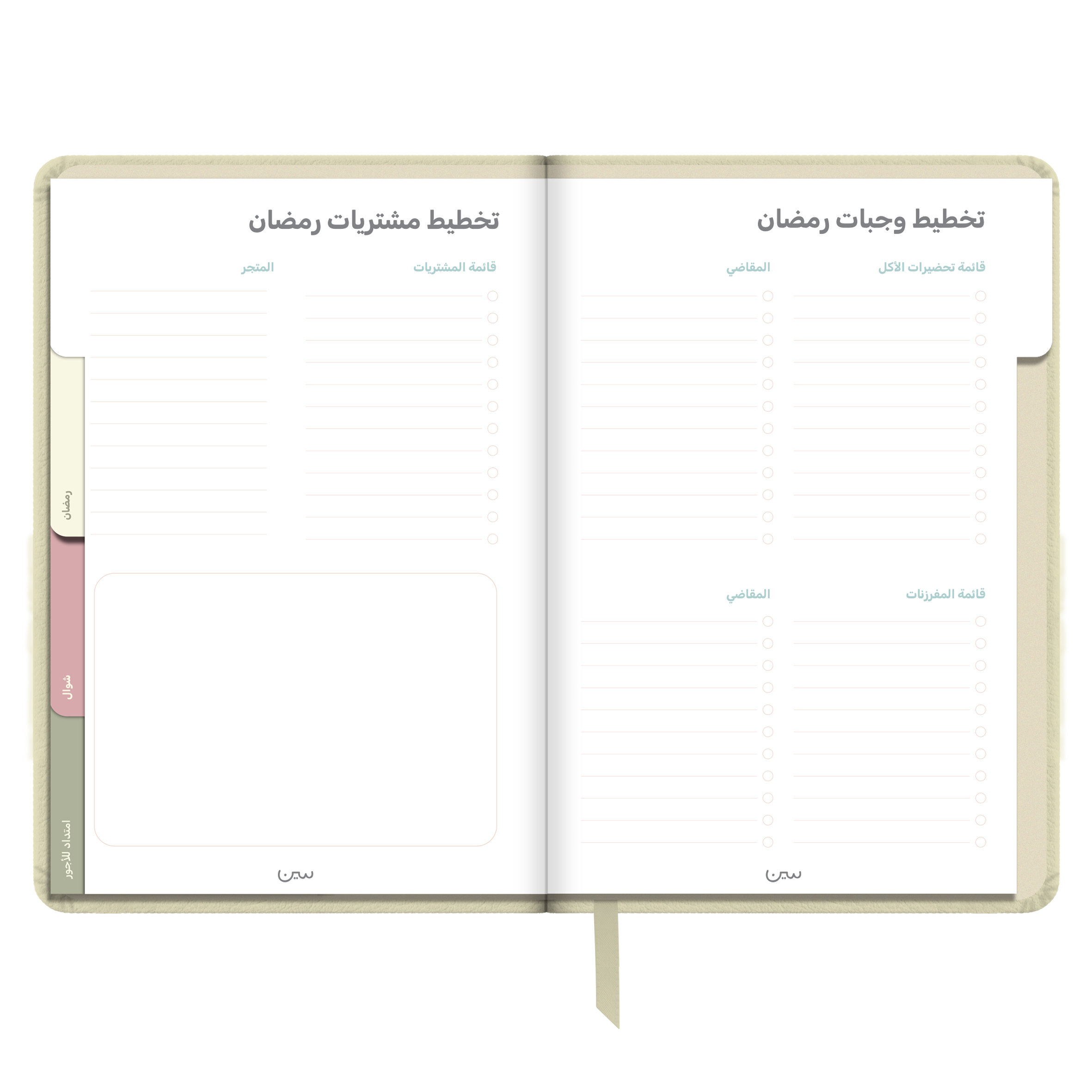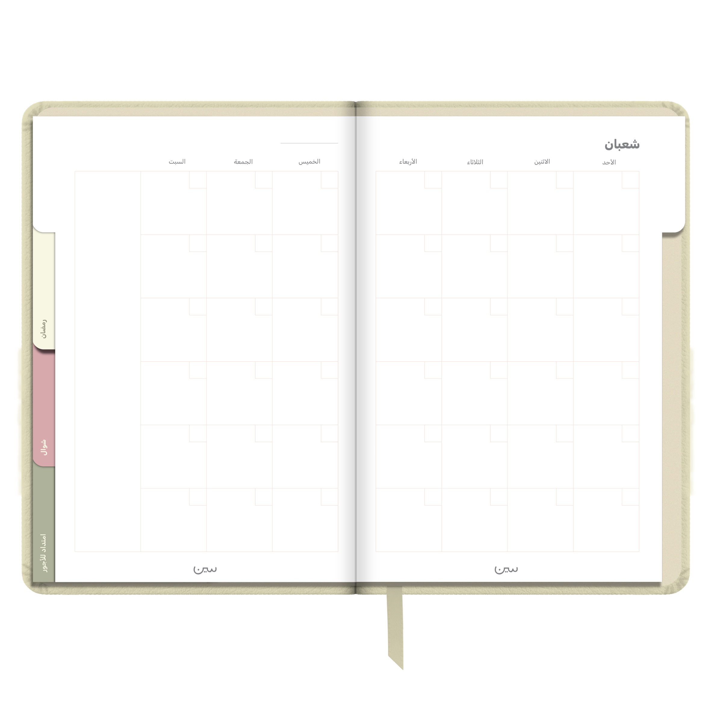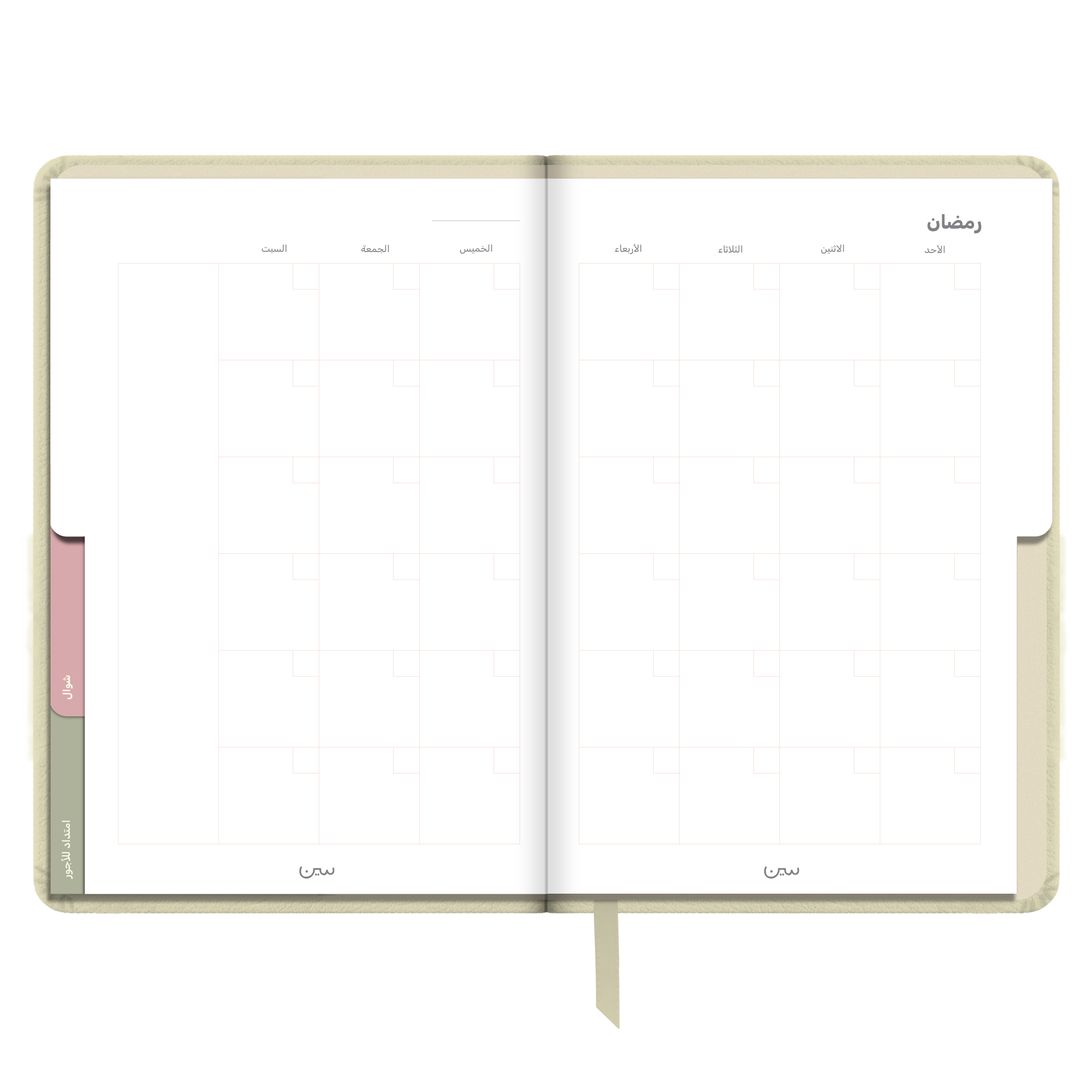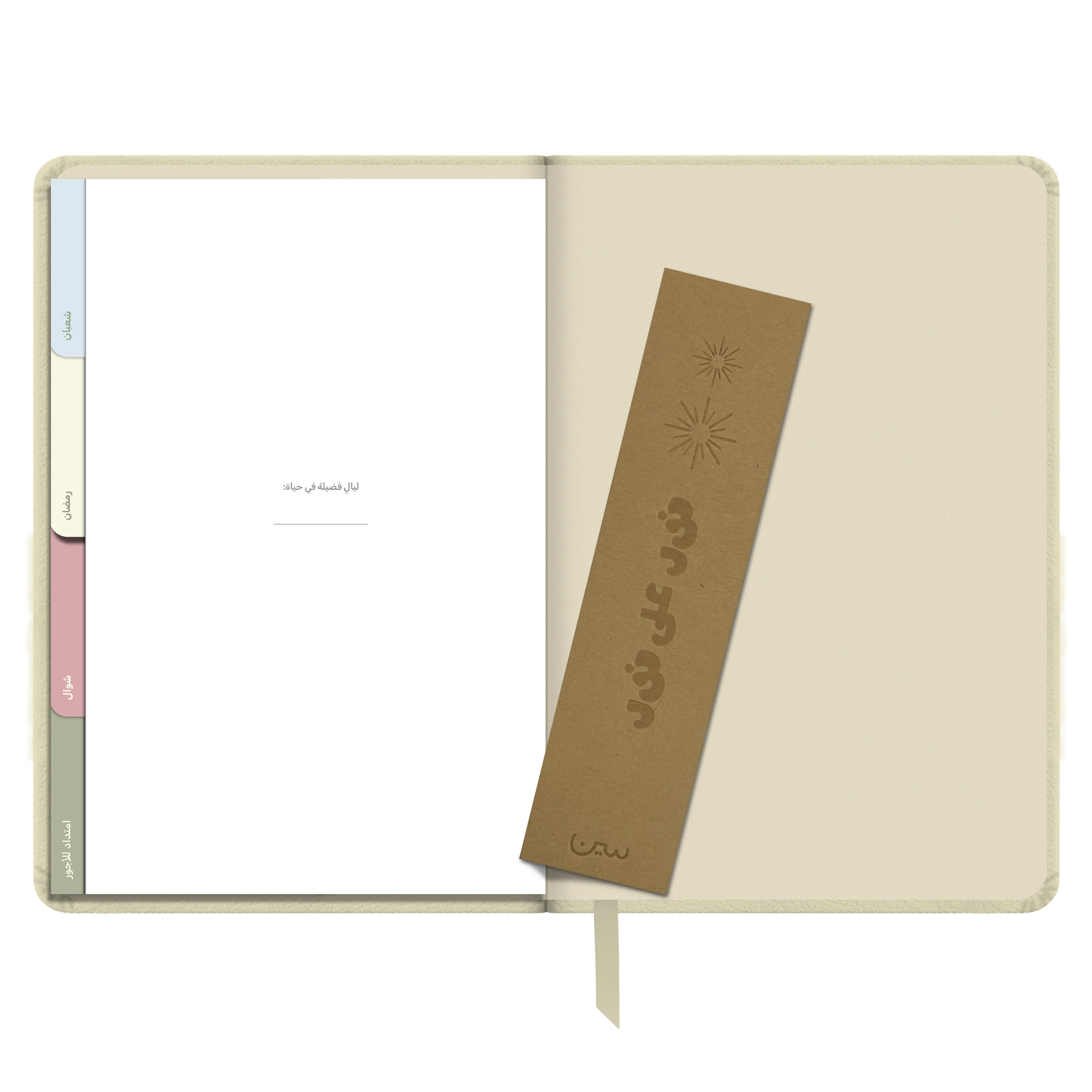 أجندة «نور على نور» الرمضانية غير المؤرخة، مصنوعة من جلد أنيق وعملي، وبألوان هادئة تتناسب مع أجواء الشهر الفضيل. صُممت لتكون رفيقتك في رحلة روحانية تمتد من شعبان إلى شوال.
