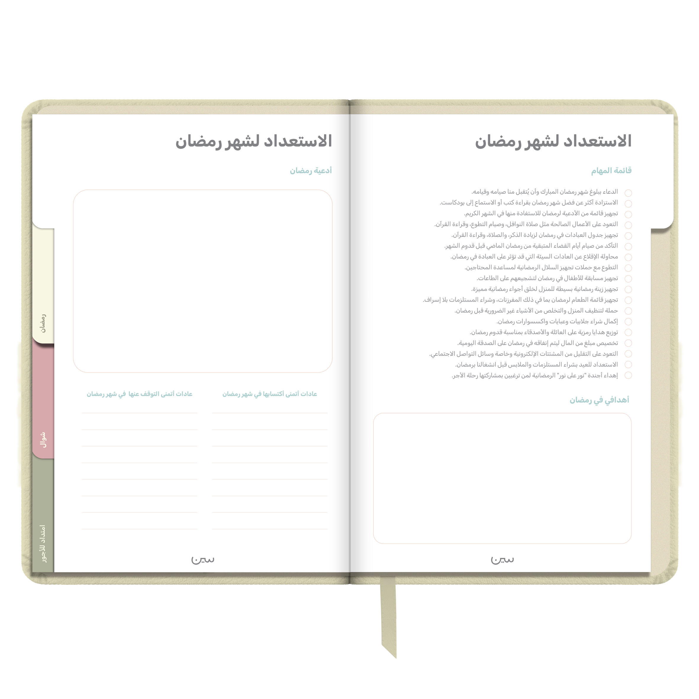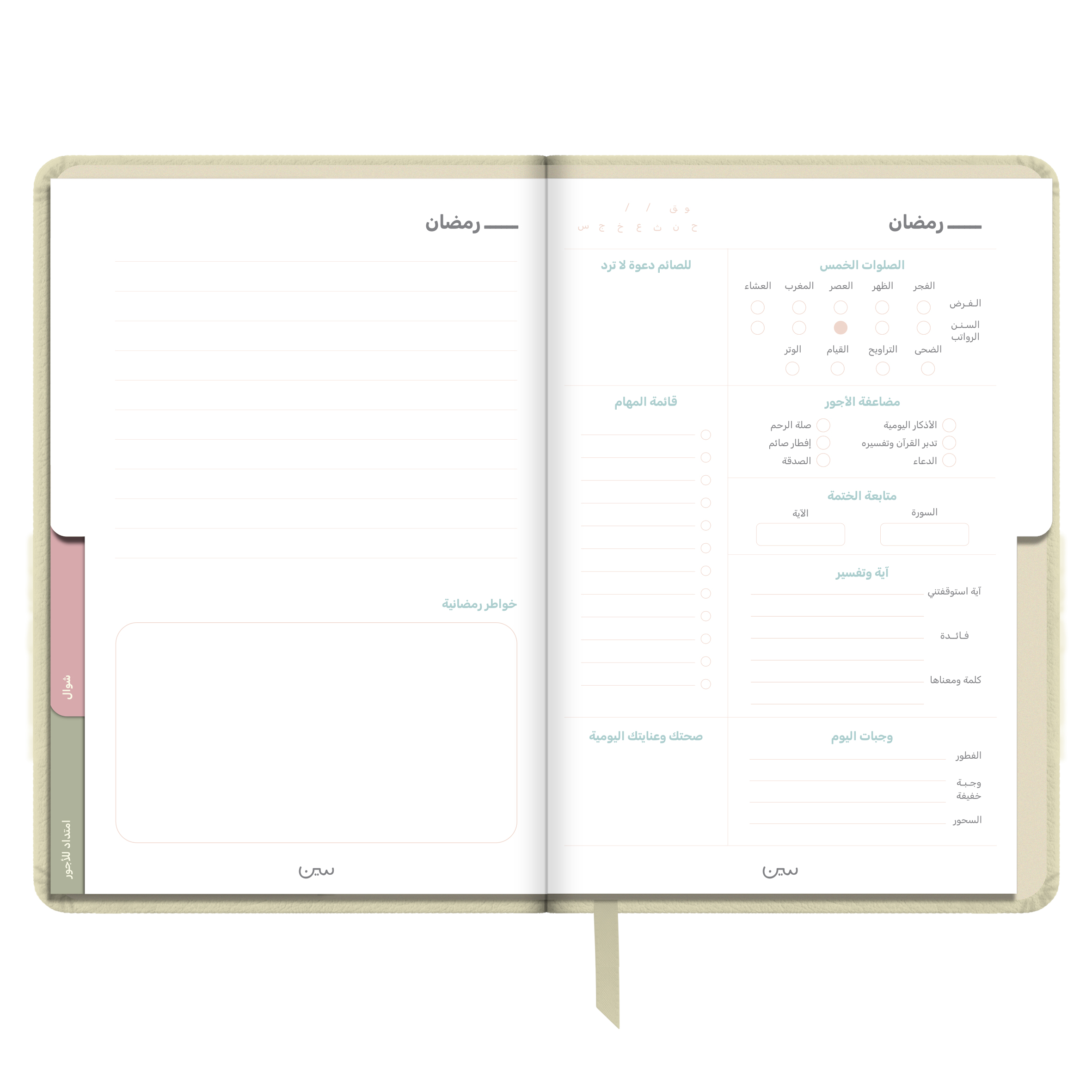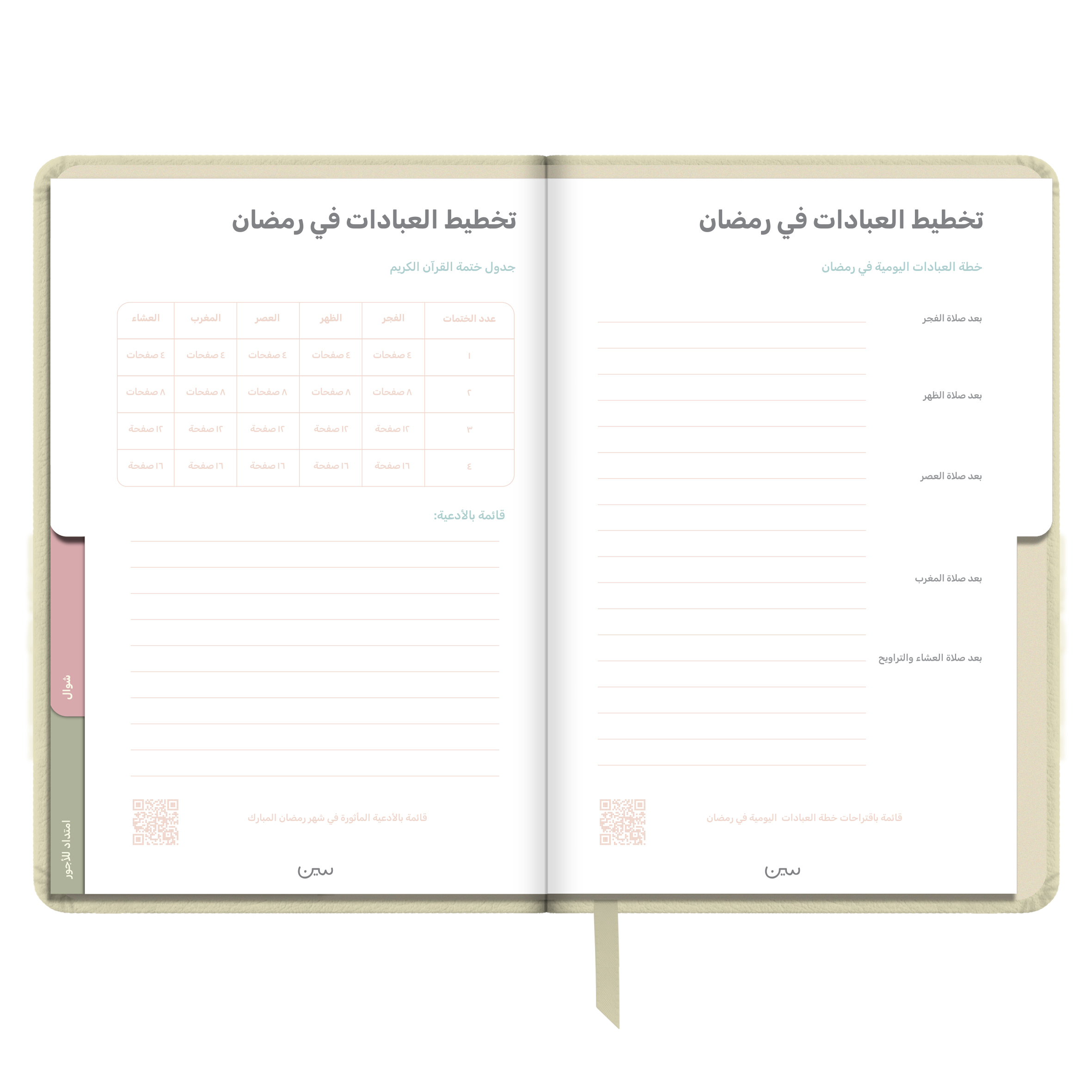 أجندة «نور على نور» الرمضانية غير المؤرخة، مصنوعة من جلد أنيق وعملي، وبألوان هادئة تتناسب مع أجواء الشهر الفضيل. صُممت لتكون رفيقتك في رحلة روحانية تمتد من شعبان إلى شوال.