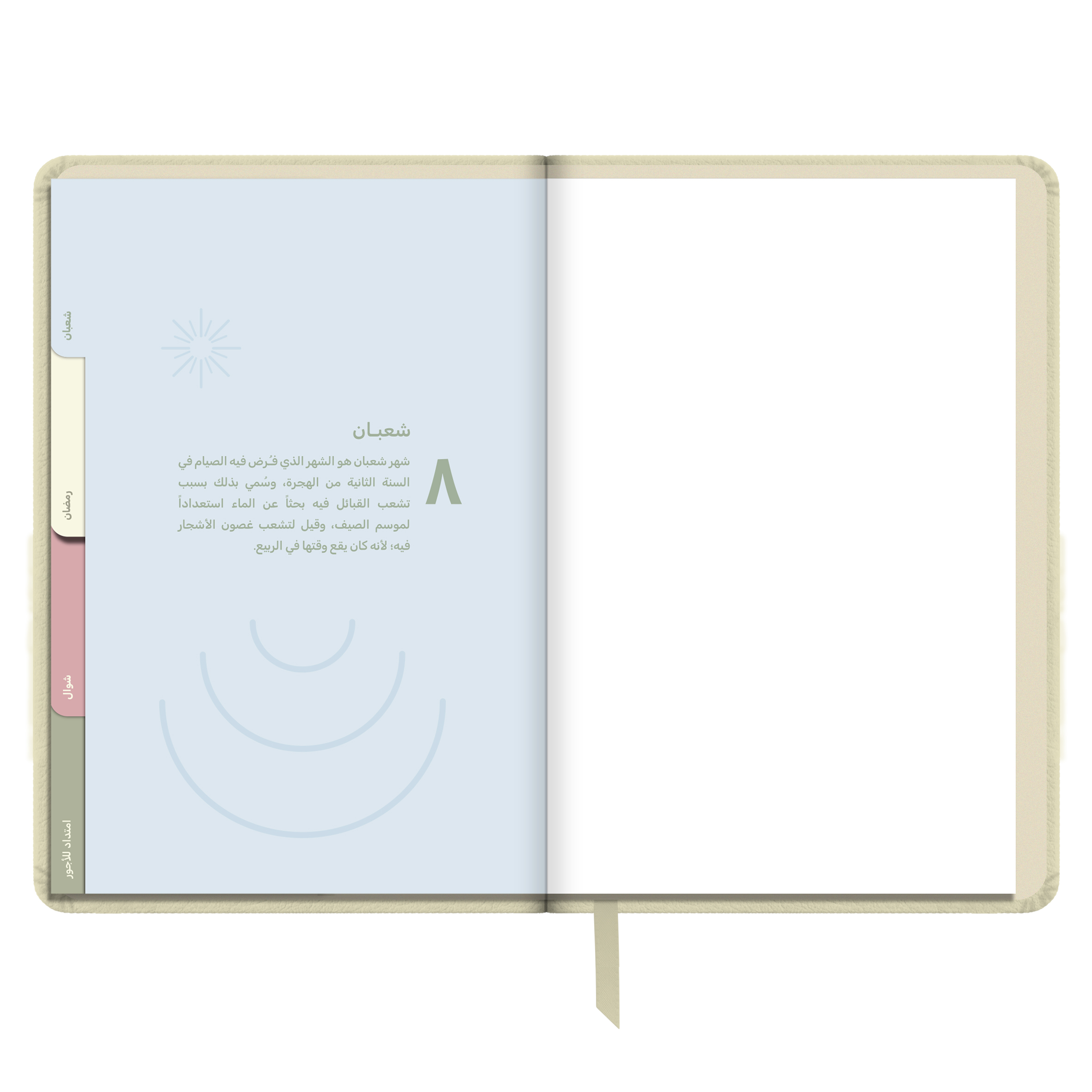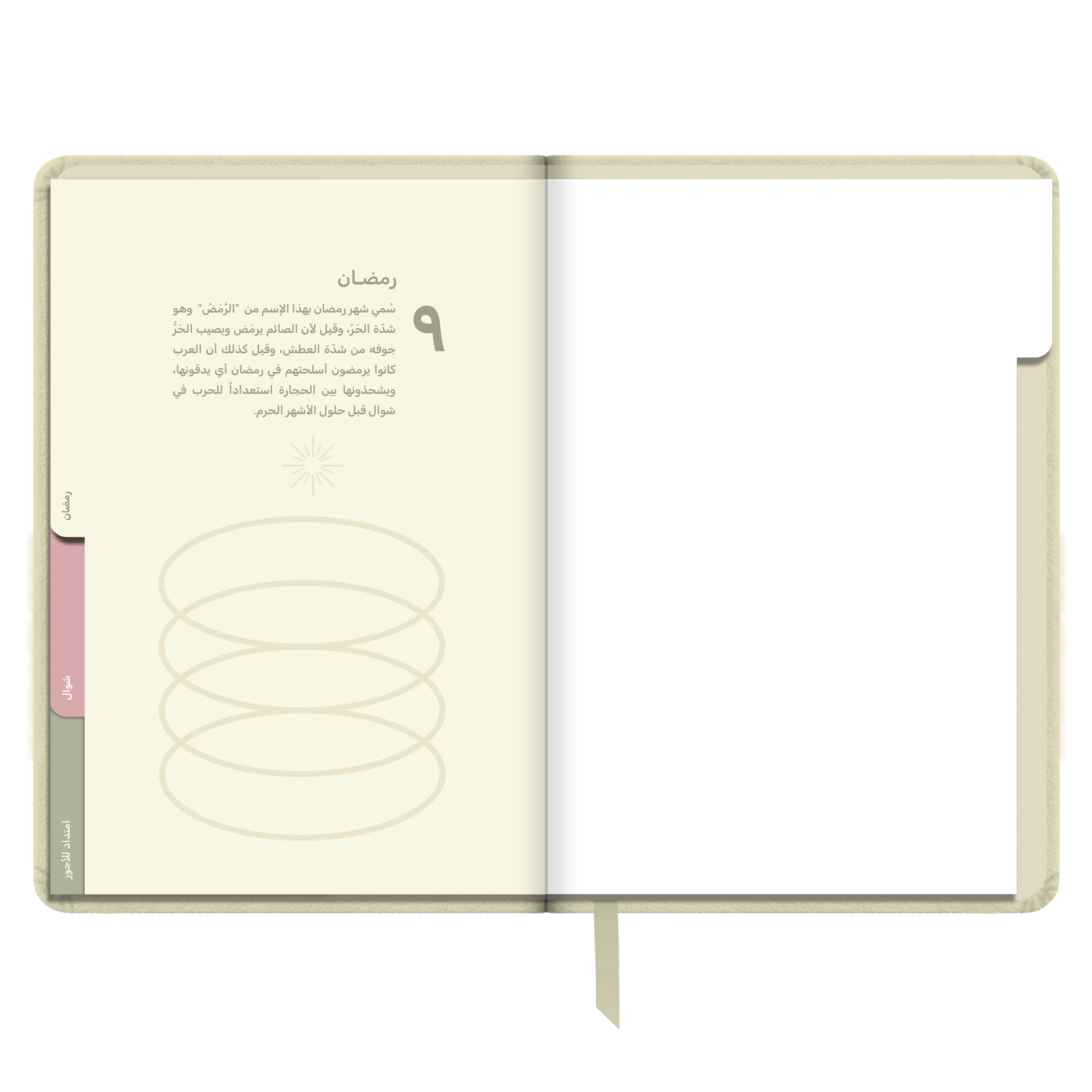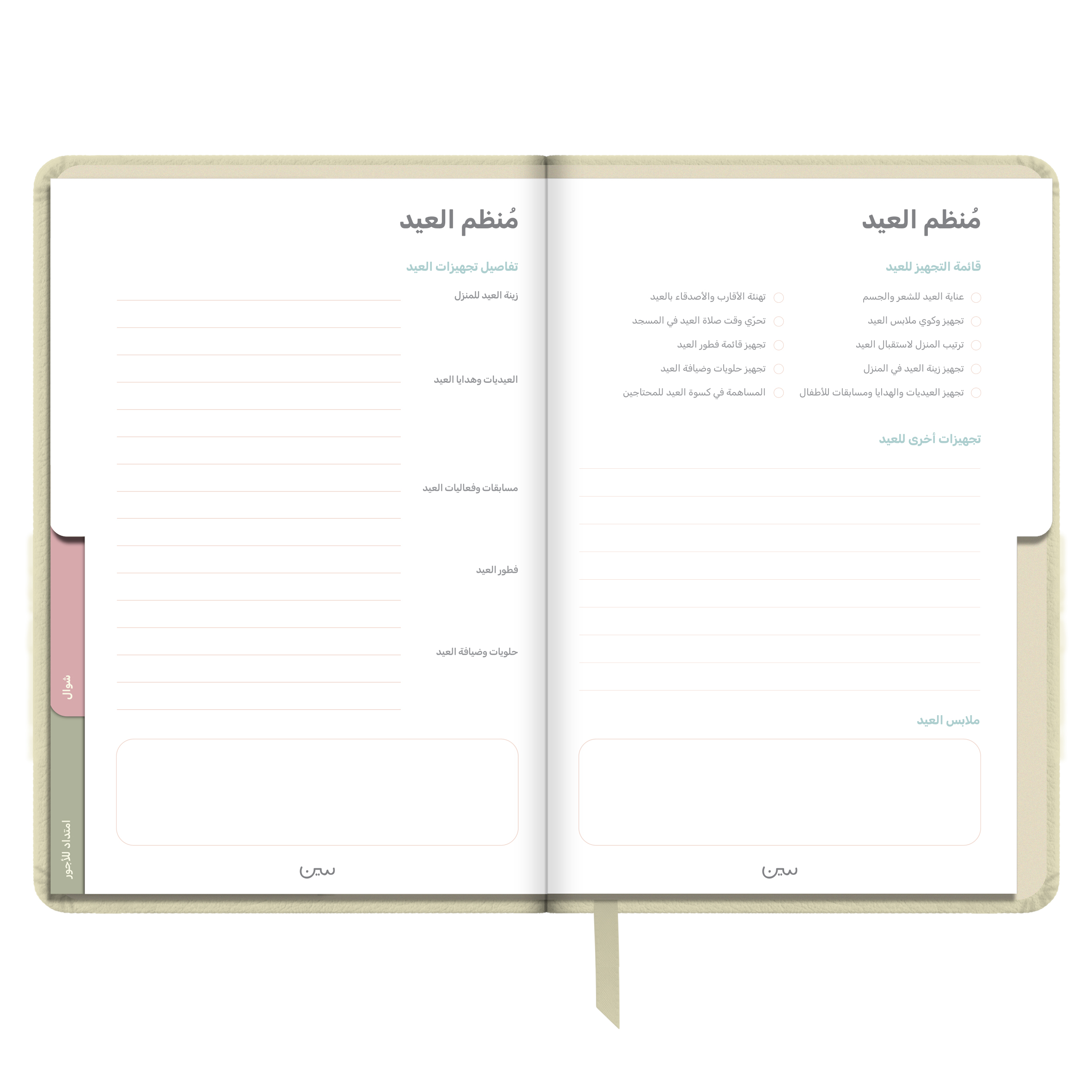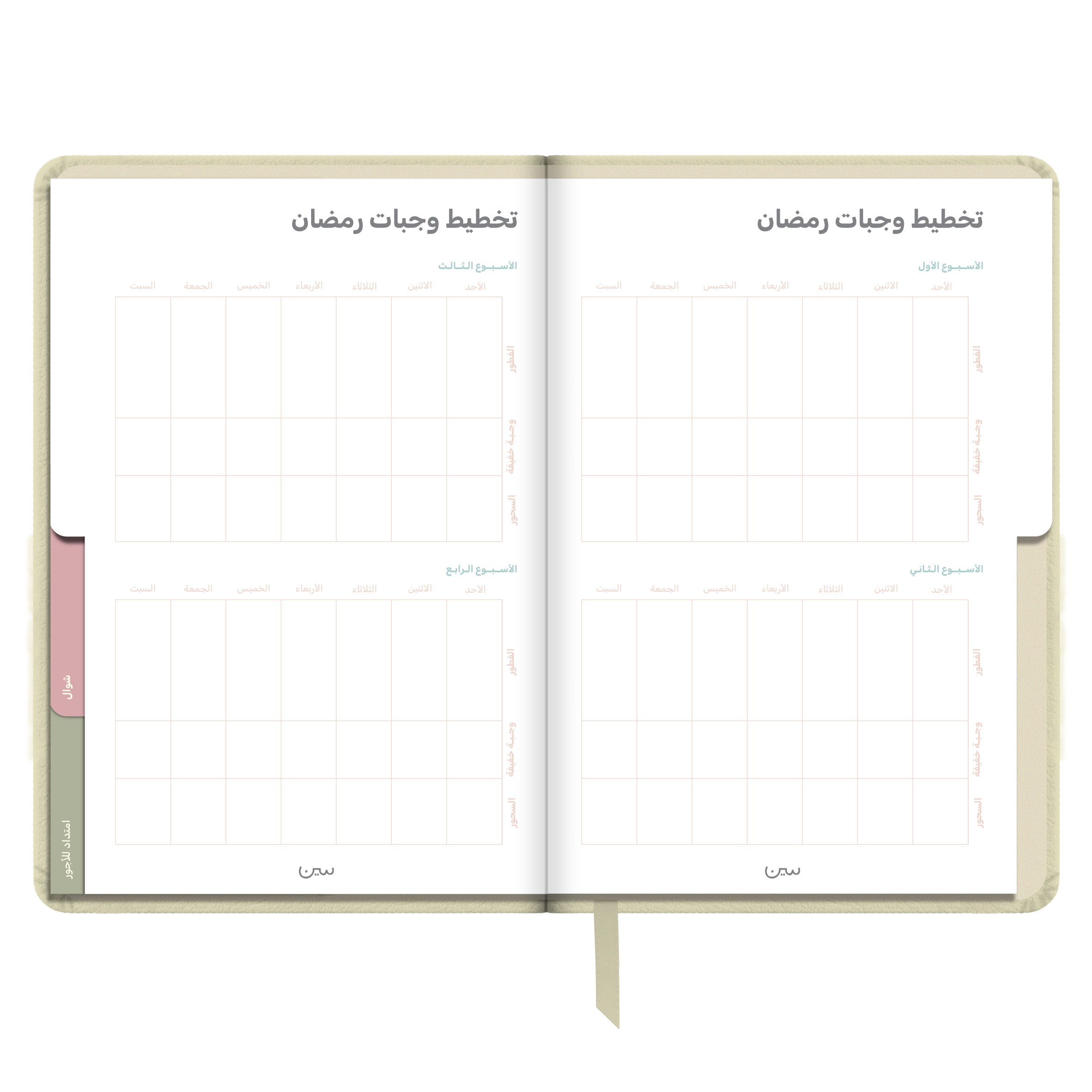 أجندة «نور على نور» الرمضانية غير المؤرخة، مصنوعة من جلد أنيق وعملي، وبألوان هادئة تتناسب مع أجواء الشهر الفضيل. صُممت لتكون رفيقتك في رحلة روحانية تمتد من شعبان إلى شوال.